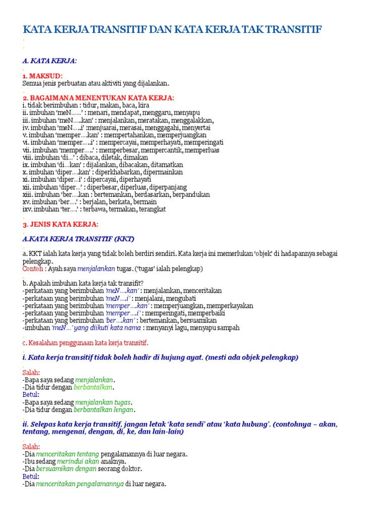 Nota Rujukan Kata Kerja Transitif from imgv2-2-f.scribdassets.com Kata kerja transitif dan tak transitif. Unsur pelengkap tidak sama dengan objek atau penyambut kerana objek atau penyambut hadir selepas kata kerja transitif yang boleh mengalami proses pasif. Kata kerja tak transitif berpelengkap. Kata kerja tak transitif ialah kata kerja yang sempurna maknanya dengan tidak memerlukan objek. Mereka hendak menziarahi rakan mereka yang sakit iaitu noni. Penggolongan kata kerja tersebut juga berlaku dalam bahasa indonesia. Contohnya akan tentang mengenai dengan di ke oleh dan lain lain salah dia bertemu rakannya di bandar dia bercerita pengalamannya di luar negara perompak itu berlari tepi jalan raya saya tidak terangkat kotak itu. Kata kerja transitif dan tak transitif.